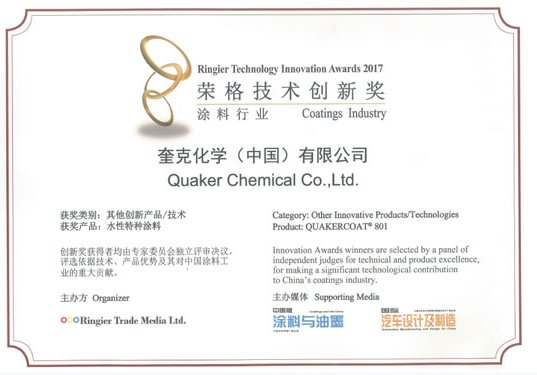 中國粉體網(wǎng)訊 2017年5月24日,在上海舉行的涂料行業(yè)—榮格技術(shù)創(chuàng)新獎頒獎典禮上,奎克憑借高性能快干型水性涂料QUAKERCOAT® 801再度獲得殊榮。