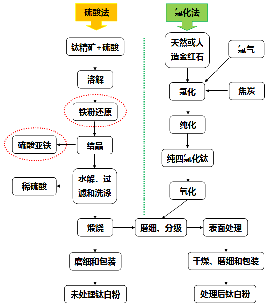 根據(jù)公開(kāi)數(shù)據(jù)統(tǒng)計(jì),2016年收官價(jià)格為15300元/噸,而在年初價(jià)格僅為10900元/噸,年漲幅高達(dá)40.36%,每噸上漲近5000元。而2017年的鈦白粉依然坐在了漲價(jià)的風(fēng)口,價(jià)格不斷攀升且絲毫沒(méi)有回轉(zhuǎn)之意。查閱資料可知,鈦白粉生產(chǎn)方法主要有硫酸法和氯化法,具體流程如下: