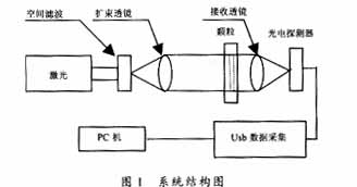 系統(tǒng)原理結(jié)構(gòu)圖如圖1所示。由激光器發(fā)出的光束經(jīng)空間濾波器擴束成平行單色光。當(dāng)該平行光照射在測量區(qū)中的顆粒群時便產(chǎn)生光的衍射現(xiàn)象。衍射散射光的強度分布與測量區(qū)中被照射的顆粒直徑、顆粒數(shù)有關(guān)。衍射光被接收透鏡聚焦在半圓多元光電探測器上。此探測器將含有顆粒直徑和顆粒數(shù)信息的衍射光信號轉(zhuǎn)換成相應(yīng)的電信號,經(jīng)信號前置處理電路及USB數(shù)據(jù)采集卡轉(zhuǎn)換成數(shù)字信號送入PC機計算處理,得到顆粒的粒度分布和濃度情況。