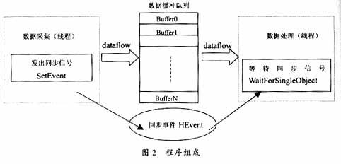 將數(shù)據(jù)處理部分定義為數(shù)據(jù)處理線程,以便處理圖形操作及數(shù)據(jù)處理等較耗時的工作。最初,數(shù)據(jù)處理線程不做任何工作,而是在Win32API函數(shù)WaitForSingleObject的作用下進入睡眠狀態(tài)(見圖2),此時它不消耗CPU任何時間,可保證數(shù)據(jù)采集線程代碼有充分的運行機會。當(dāng)數(shù)據(jù)采集線程取得指定長度的數(shù)據(jù)到用戶空間時,再用Win32API函數(shù)SetEvent將指定事件消息發(fā)送給數(shù)據(jù)處理線程,則數(shù)據(jù)處理線程即刻恢復(fù)運行狀態(tài),迅速對這批數(shù)據(jù)進行處理。
