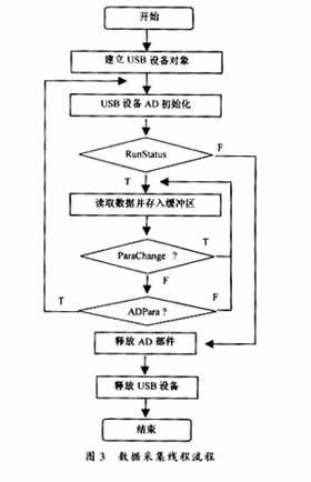 將數(shù)據(jù)采集部分定義為工作者線程(數(shù)據(jù)采集線程)。USB設(shè)備與AD轉(zhuǎn)換進度同步完全由硬件和驅(qū)動程序自動完成。用戶若要用程序方式實現(xiàn)連續(xù)數(shù)據(jù)采集,對其軟件實現(xiàn)就顯得極為容易。數(shù)據(jù)采集線程每次用ReadDeviceAD函數(shù)(USB采集卡接口函數(shù))讀取AD數(shù)據(jù)時,設(shè)備驅(qū)動程序會按照AD轉(zhuǎn)換進度將AD數(shù)據(jù)一一放進用戶數(shù)據(jù)緩沖區(qū);當(dāng)完成該次所指定的采樣點數(shù)時,便會返回;當(dāng)再次用這個函數(shù)讀取數(shù)據(jù)時,會接著上一次的位置傳遞數(shù)據(jù)到用戶數(shù)據(jù)緩沖區(qū)。高速數(shù)據(jù)采集要求每兩次調(diào)用ReadDeviceAD之間的時間間隔越短越好。由圖3數(shù)據(jù)采集線程流程圖可知,為保證每兩次ReadDeviceAD之間較小的時間間隔,應(yīng)盡量減少USB設(shè)備AD初始化的次數(shù)。為此,采用了一次性設(shè)置增益的方法。即根據(jù)所采信號大小和對應(yīng)的原增益計算出原始信號大小,然后根據(jù)信號應(yīng)放大的數(shù)值換算出合適的增益進行一次設(shè)置。另外,設(shè)置了一個布爾控制變量(ParaChange)來記錄增益是否被剛剛改變,如果剛剛改變就跳過增益是否應(yīng)該改變(ADPARA)的判斷直接讀取采集數(shù)據(jù)從而減少讀取采集數(shù)據(jù)時間間隔,以利于高速采集。圖3中Runstatus為數(shù)據(jù)采集線程運行控制布爾變量。