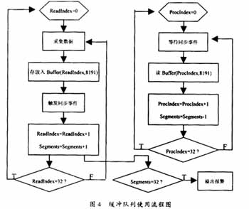 數(shù)據(jù)處理線程可能處理花費CPU過多時間的工作,從而導(dǎo)致數(shù)據(jù)處理線程阻塞;而數(shù)據(jù)采集線程則在不停地采集數(shù)據(jù),這樣數(shù)據(jù)處理線程很有可能因此而丟失數(shù)據(jù)采集線程發(fā)來的某一段數(shù)據(jù)。為避免這個問題,建立了數(shù)據(jù)緩沖隊列。即假設(shè)數(shù)據(jù)采集線程每一次從設(shè)備上取出8K數(shù)據(jù),那么就創(chuàng)建一個緩沖隊列,在用戶程序中開辟一個兩維數(shù)組,如Buffe(Count??1,DataLen??1),將DataLen視為數(shù)據(jù)采集線程每次采集的數(shù)據(jù)長度(DataLen必須等于采集通道數(shù)的整數(shù)倍),從而保證采集數(shù)據(jù)與各通道的一一對應(yīng)關(guān)系。另外,也要注意在USB采集卡每次增益改變時要保證數(shù)據(jù)采集線程和數(shù)據(jù)處理線程從第一個緩沖隊列的第一數(shù)據(jù)存儲和讀取。這可以保證采集數(shù)據(jù)與各通道的一一對應(yīng)關(guān)系,以防止數(shù)據(jù)錯位。Count則為緩沖隊列的成員個數(shù)。應(yīng)根據(jù)計算機物理內(nèi)存大小和總體使用情況來設(shè)定。假如設(shè)成32,則這個緩沖隊列實際上就是數(shù)組Buffer(31,8191)的形式,共32個緩沖隊列(數(shù)組各維的基為0)。它跟一個普通的緩沖區(qū),如一維數(shù)組差不多,唯一不同是,兩個線程首先要通過改變Count字段的值,即Count的索引值(ReadIndex或ProcIndex)來填充和引用某一段DataLen長度的數(shù)據(jù)緩沖區(qū)。需要注意的是,兩個線程不共用一個Count的索引值。具體情況(見圖4)是當(dāng)數(shù)據(jù)采集線程在AD部件被初始化之后,首次采集數(shù)據(jù)時,則將自己的ReadIndex下標(biāo)置為0,即用第一個緩沖區(qū)采集AD數(shù)據(jù)。當(dāng)采集完后,則向數(shù)據(jù)處理線程發(fā)送消息,且兩個線程的公共變量Segments加1(Segments變量記錄當(dāng)前時刻緩沖隊列中有多少個已被數(shù)據(jù)采集線程使用了,但是卻沒被數(shù)據(jù)處理線程處理掉的緩沖區(qū)數(shù)量。)然后再接著將ReadIndex偏移至1,再用第二個緩沖區(qū)采集數(shù)據(jù)。再將Segments加1,至到Readlndex等于32為止,然后再回到0位置,重新開始。而數(shù)據(jù)處理線程則在每次接受到消息時判斷有多少由于自己被堵塞而沒有被處理的緩沖區(qū)個數(shù),然后逐一進行處理,最后再從Segments變量中減去在所接受到的當(dāng)前事件下所處理的緩沖區(qū)個數(shù)。因此,即便是數(shù)據(jù)處理線程由于系統(tǒng)的偶爾繁忙而被堵塞,也很難使數(shù)據(jù)丟失。而且,通過這種方案,用戶還可以在數(shù)據(jù)采集線程中對Segments加以判斷,觀察其值是否大于32,如果大于,則緩沖區(qū)隊列肯定因數(shù)據(jù)處理線程的堵塞而被溢出;如果溢出則報警。因此,具有強大的容錯處理能力。