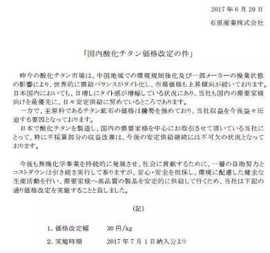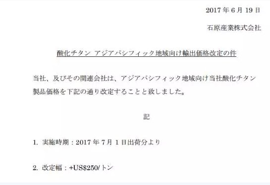 6月20日,石原又宣布自2017年7月1日起,在日本國(guó)內(nèi)對(duì)鈦白粉產(chǎn)品進(jìn)行漲價(jià),漲價(jià)幅度為30日元/公斤。