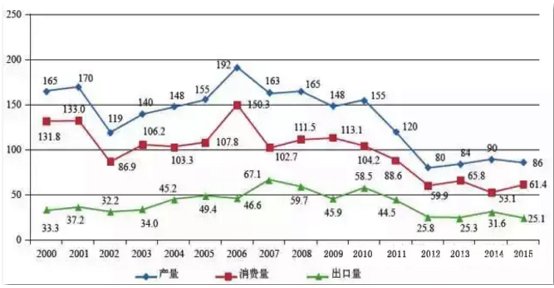 2000 ~ 2015 年我國石墨產(chǎn)量、消費量和出口量變化圖