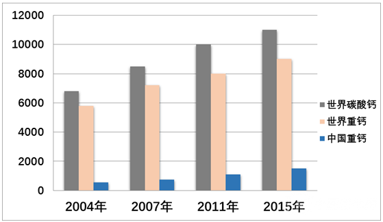 世界碳酸鈣、重鈣及中國重鈣的變化趨勢(單位:萬噸)