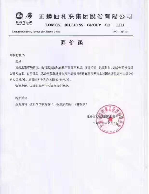 昨天,龍蟒佰利聯(lián)下發(fā)了調(diào)價通知,氯化法鈦白粉銷售價格在原價基礎(chǔ)上對國內(nèi)各類客戶上調(diào)300元/噸,對國際類客戶上調(diào)50美元/噸。漲價的原因很簡單,公司氯化法鈦白粉訂單充足,庫存較低,供應(yīng)緊張。雖然價格漲不停,實質(zhì)上,經(jīng)銷商或買商都有較大的議價能力。