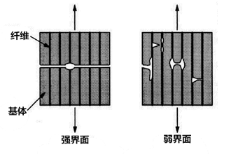 強(qiáng)的界面粘結(jié)往往導(dǎo)致脆性破壞,裂紋在復(fù)合材料的任一部位形成并迅速擴(kuò)散至復(fù)合材料的橫截面,導(dǎo)致平面斷裂。這是由于纖維的彈性模量不是大大高于基體,因此在斷裂過程中,強(qiáng)界面結(jié)合不產(chǎn)生額外的能量消耗。