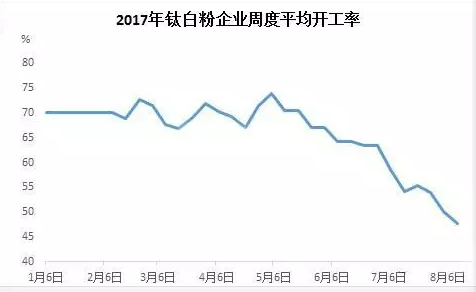 自環(huán)保檢查以來,鈦白粉行業(yè)的整體開工率呈逐漸走低的趨勢,2017年年初開工率較為穩(wěn)定,平均開工率在70%附近,2-4月份,鈦白粉市場整體開工率開始出現(xiàn)不規(guī)則變動(dòng),從5月初開始,鈦白粉整體開工率開始出現(xiàn)逐月遞減趨勢。目前鈦白粉市場整體開工率不足50%,維持在47%水平附近。