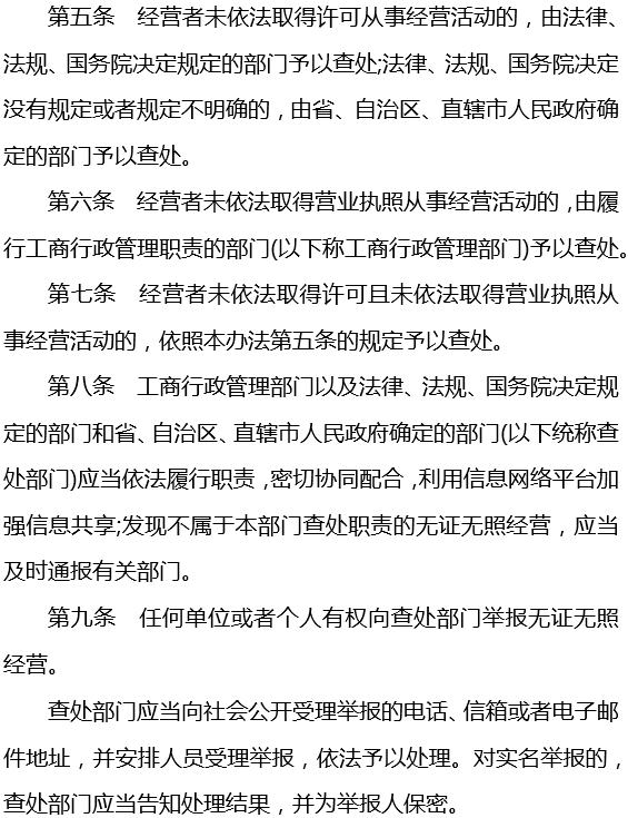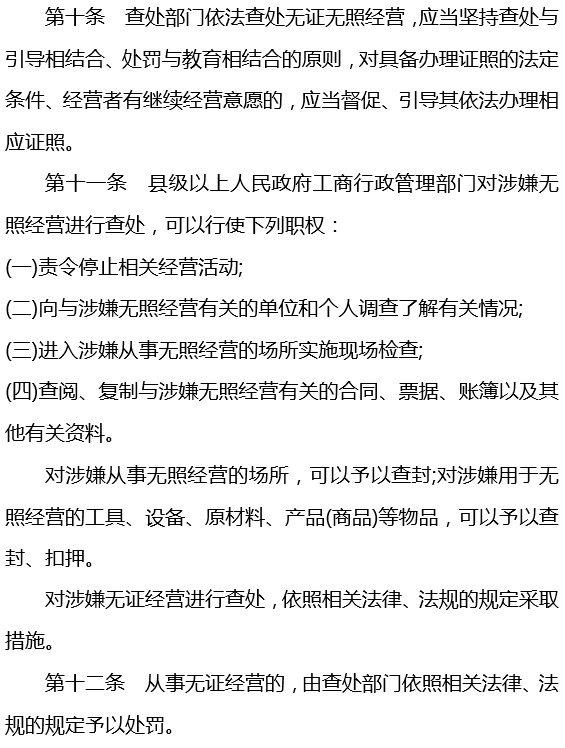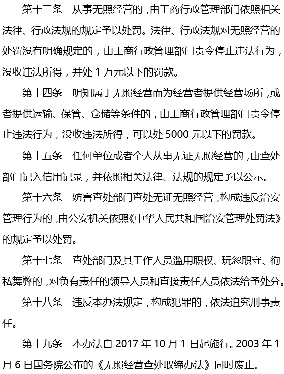 中國粉體網(wǎng)訊 日前,國務(wù)院總理李克強簽署國務(wù)院令,公布《無證無照經(jīng)營查處辦法》(以下簡稱《辦法》),自2017年10月1日起施行。《辦法》在限定無證無照經(jīng)營的查處范圍、執(zhí)法方式和法律責(zé)任等方面作了適當(dāng)調(diào)整!掇k法》強調(diào),對無證無照經(jīng)營,要嚴(yán)格依法查處。具體辦法如下: