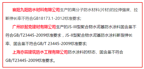 中國(guó)粉體網(wǎng)訊 近日,湖北宜昌市工商局發(fā)布2017年5月份流通領(lǐng)域商品質(zhì)量抽檢情況及消費(fèi)提示,在裝飾裝修及建筑材料不合格商品明細(xì)表中,襄陽(yáng)九陽(yáng)防水材料有限公司、廣州歐耐克建材有限公司、上海亦辰建筑防水工程有限公司等多家防水建材企業(yè)赫然在列。