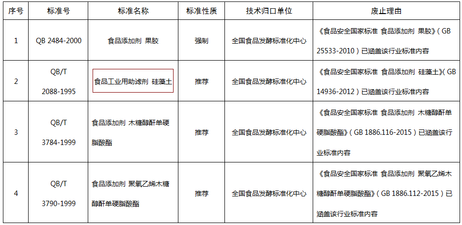 《食品工業(yè)用助濾劑 硅藻土》(QB/T 2088-1995)擬廢止的理由是《食品安全國家標(biāo)準(zhǔn) 食品添加劑 硅藻土》(GB 14936-2012)已涵蓋該行業(yè)標(biāo)準(zhǔn)內(nèi)容。