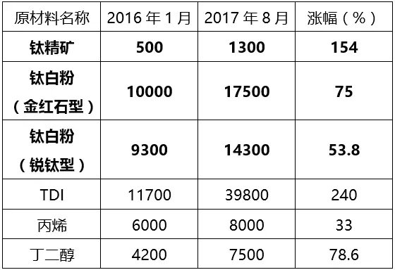 從上圖看出,自環(huán)保督察持續(xù)的近兩年時(shí)間里,鈦精礦漲幅達(dá)154%、鈦白粉(金紅石型)漲幅75%、鈦白粉(銳鈦型)漲幅53.8%、TDI漲幅達(dá)240%。