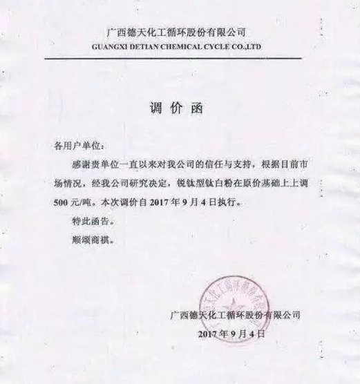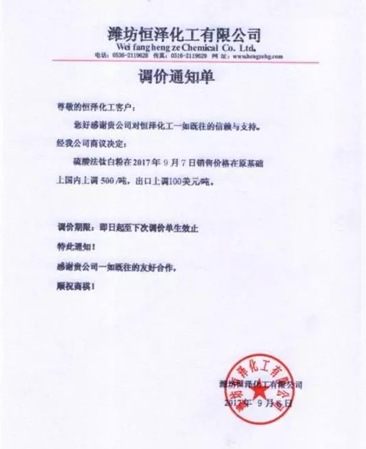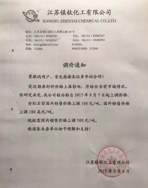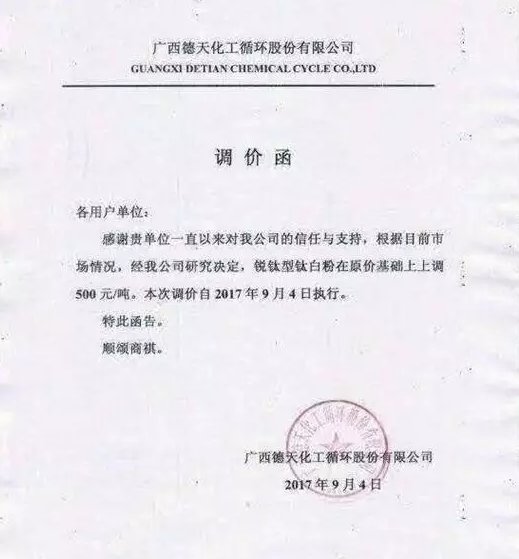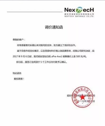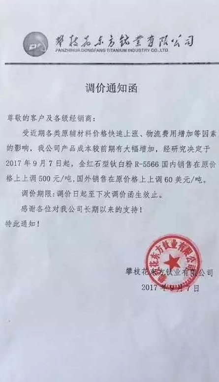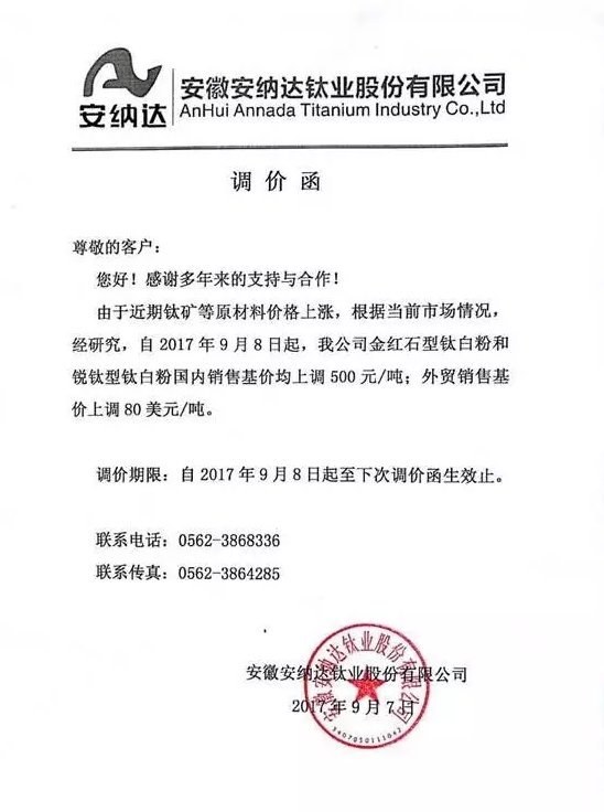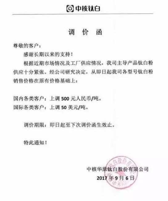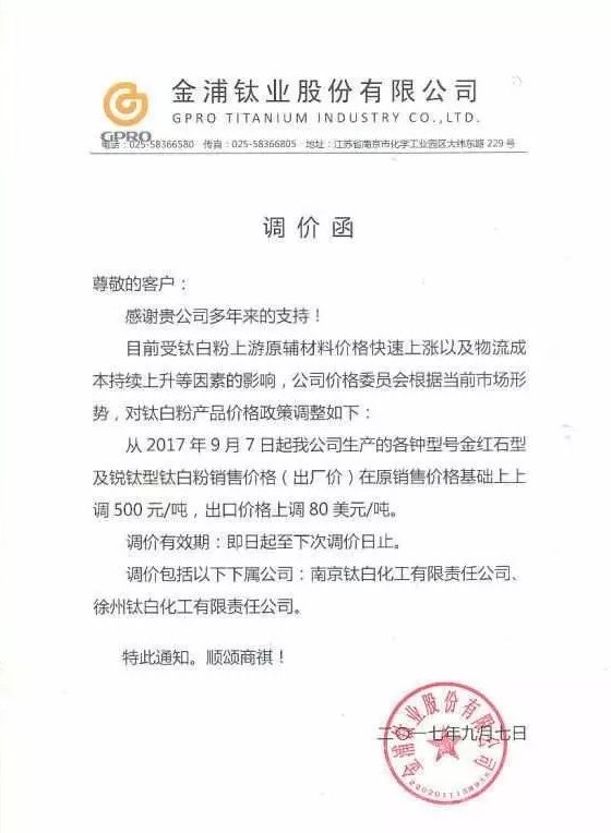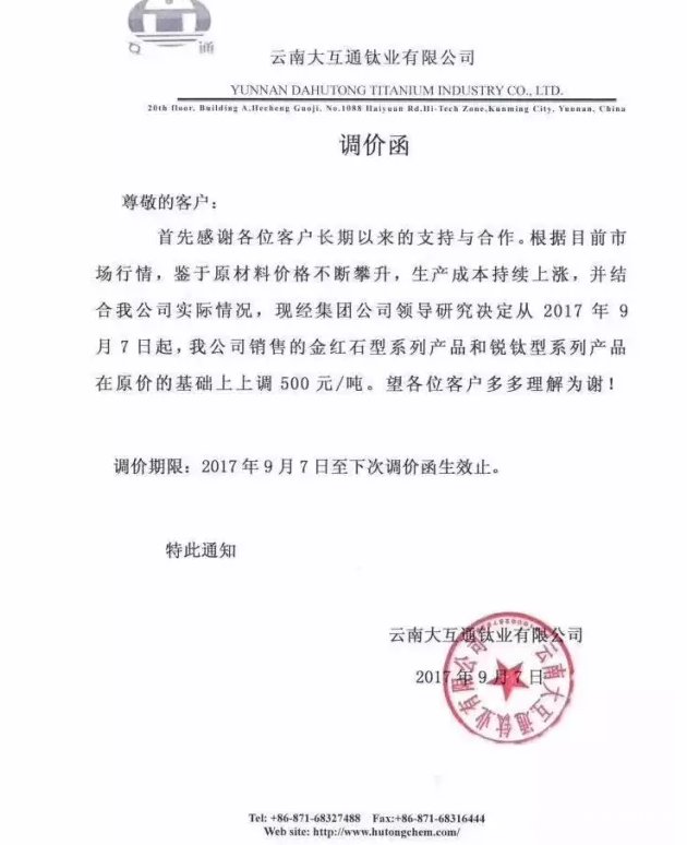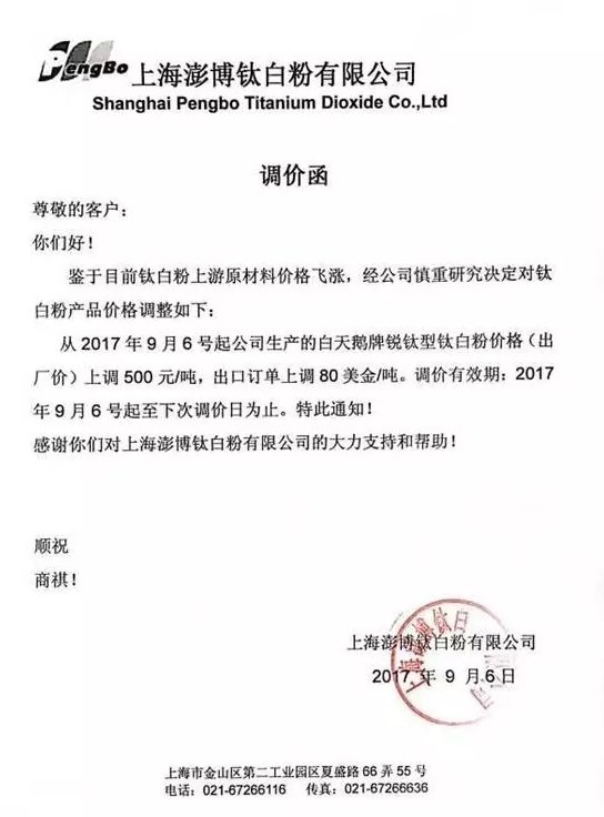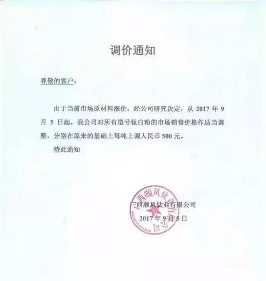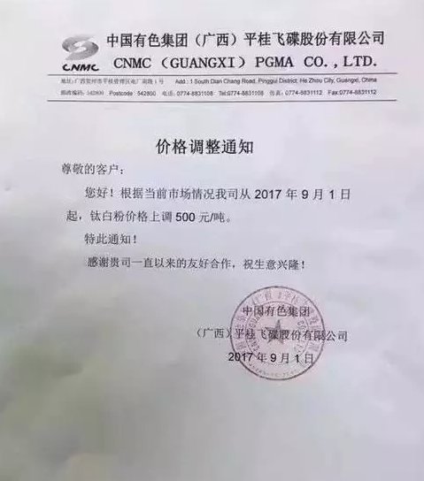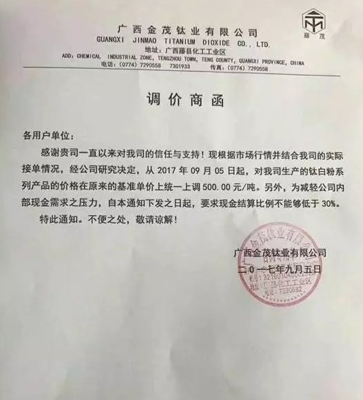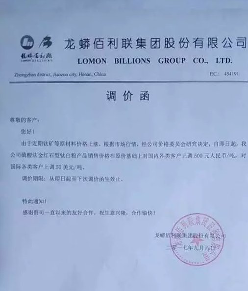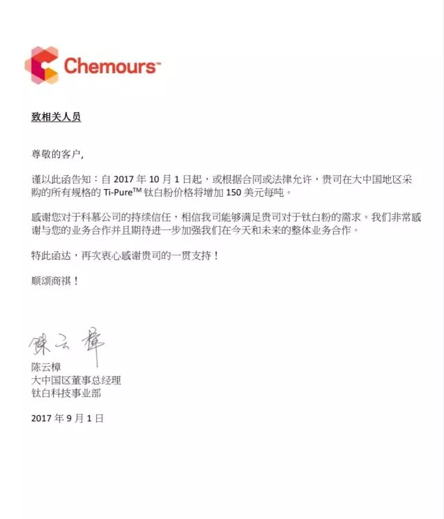 中國的粉體網(wǎng)訊 近日國外內(nèi)鈦白粉企業(yè)紛紛漲價(漲價函),其中龍蟒佰利再次發(fā)布漲價通知,此輪漲價已是年內(nèi)的第七次調(diào)價。國際巨頭科慕公司也發(fā)出鈦白粉提價公告。公告中稱,自10月1日起,科慕旗下所有規(guī)格的Ti-Pure™鈦白粉價格在中國大陸原有的基礎(chǔ)上上調(diào)150美元/噸(合計975元/噸)。
