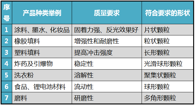 顆粒的形狀會影響粉體的流動性、研磨性、化學(xué)適性、松裝密度、氣體透過性、壓制性和燒結(jié)體強度等,為了突出一些產(chǎn)品的優(yōu)良特性,工業(yè)和科研領(lǐng)域?qū)Ψ垠w產(chǎn)品的功能進行顆粒形狀設(shè)計,損高產(chǎn)品質(zhì)量和性能。以下是顆粒形狀對產(chǎn)品性能的影響:
