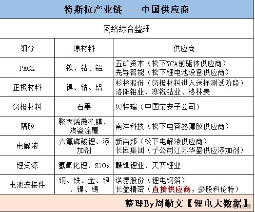 如此龐大的目標(biāo)計(jì)劃,對(duì)應(yīng)的是強(qiáng)大的資金供給以及穩(wěn)定的資源供應(yīng)鏈。鋰電大數(shù)據(jù)特別梳理了與特斯拉鋰電池產(chǎn)業(yè)鏈相關(guān)的中國(guó)供應(yīng)商。