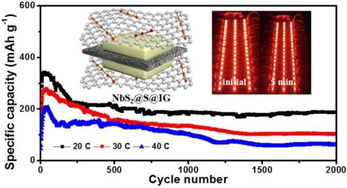 中國科學(xué)院福建物質(zhì)結(jié)構(gòu)研究所結(jié)構(gòu)化學(xué)國家重點實驗室研究員王瑞虎課題組和溫州大學(xué)教授楊植合作,將水蒸氣刻蝕的多孔NbS2和高導(dǎo)電碘摻雜石墨烯(IG)復(fù)合到三元混合硫正極系統(tǒng)中,合成了由IG包裹的三明治型NbS2@S@IG正極材料。在這種特殊三明治結(jié)構(gòu)中,層狀NbS2的高極性和強的親和力促進多硫化物的物理攔截和化學(xué)吸附,協(xié)同解決了多硫化物溶解和穿梭效應(yīng)的問題;NbS2的高電導(dǎo)率和孔隙率提高了界面電荷轉(zhuǎn)移和離子遷移,從而提高了Li-S電池氧化還原反應(yīng)的電化學(xué)動力學(xué);IG包圍的夾層結(jié)構(gòu)不僅可以使硫物質(zhì)和層狀NbS2(或IG)之間發(fā)生緊密接觸,而且在充放電過程中能承受硫正極大的體積波動。由NbS2@S@IG組裝的Li-S電池,在20-40C的高倍率下,表現(xiàn)出優(yōu)異的循環(huán)穩(wěn)定性。