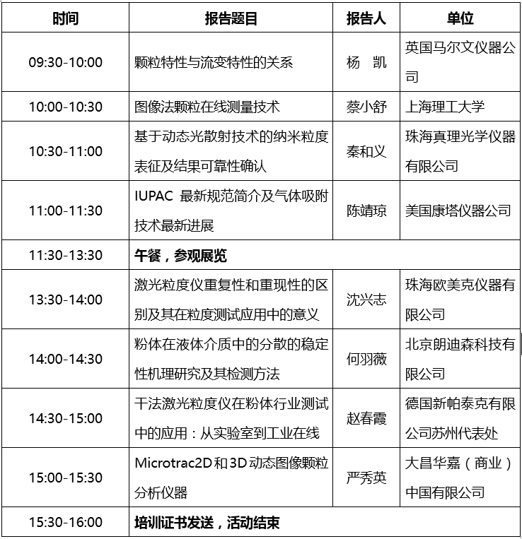 本期培訓班將與“IPB 2017第十五屆中國國際粉體加工/散料輸送展覽會”(10月16-18日)和“2017能源顆粒材料制備及測試技術(shù)研討會”(10月16日)同期同地舉辦,展覽期間參與本次培訓的部分廠商將現(xiàn)場展示最新推出的測試儀器。培訓班除將邀請專家介紹最新的測試技術(shù)進展外,還將重點針對大家在實際工作中可能遇到的問題進行分析并解答,同時參加培訓班的學員還可到展位現(xiàn)場了解操作相關(guān)測試設(shè)備。有關(guān)培訓班詳情如下:
