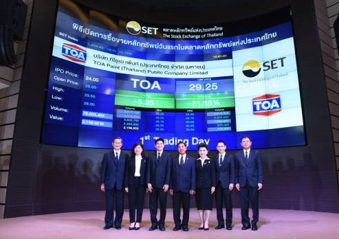 據(jù)TOA首席執(zhí)行官Jatuphat Tangkaravakoon表示,相信公司股票將吸引相關(guān)投資者青睞,因為公司具有良好基本面和發(fā)展?jié)摿,公司正在國?nèi)和國際市場大力拓展業(yè)務(wù)。TOA首次公開發(fā)行股票(IPO)共新發(fā)行5.060億股,吸引了大量機(jī)構(gòu)和散戶投資者,股票開盤上漲超過20%。