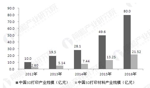 2012-2016年中國3D打印材料市場產(chǎn)值變化情況(單位:億元)