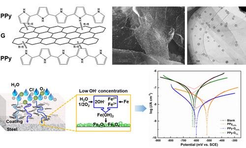 石墨烯的疏水性使其在水和水性樹脂中的分散難以實(shí)現(xiàn)。該團(tuán)隊(duì)通過微乳液聚合制備了水溶性的導(dǎo)電聚合物乳膠納米粒子作為石墨烯的插層劑(圖3),實(shí)現(xiàn)了石墨烯二維納米片在水性樹脂中穩(wěn)定分散,制備的水性環(huán)氧涂層,由于石墨烯在基體中形成物理阻隔層延長(zhǎng)腐蝕介質(zhì)的擴(kuò)散路徑,減緩腐蝕;導(dǎo)電聚合物能夠使金屬表面生成致密的鈍化膜,抑制腐蝕,協(xié)同提高復(fù)合涂層的耐腐蝕性,并通過掃描振動(dòng)電極技術(shù)(SVET)研究表明涂層具有自修復(fù)性能(圖4)。相關(guān)工作發(fā)表在ACS Applied Material & Interfaces上。