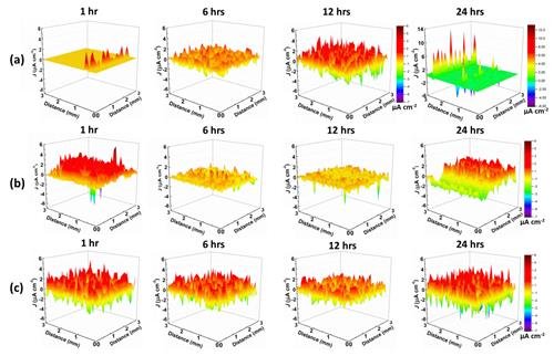 圖4.(a)空白水性涂層,(b)導(dǎo)電聚合物復(fù)合涂層(c)石墨烯雜化復(fù)合涂層缺陷處的局部電流密度分布圖