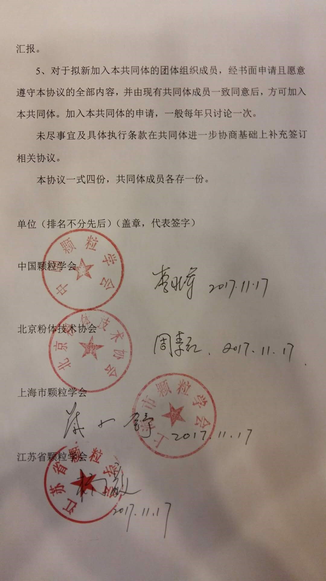2017年11月17日,在羊城舉辦的第十一屆全國顆粒測試學(xué)術(shù)會議暨2017年全國粉體測試技術(shù)應(yīng)用研討會上,中國顆粒學(xué)會、北京粉體技術(shù)協(xié)會、上海市顆粒學(xué)會、江蘇省顆粒學(xué)會四家團體組織作為發(fā)起單位,共同簽署了“顆粒技術(shù)團體標(biāo)準(zhǔn)共同體”合作協(xié)議。