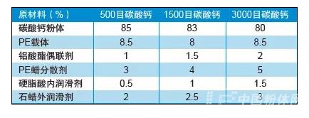 除了載體樹脂和無機粉體之外,配方中必須要添加的助劑有鋁酸酯偶聯(lián)劑、聚合物蠟類分散劑、潤滑劑等。一般無機粉體越細,上述其加入量相對增加,具體見表2所示。
