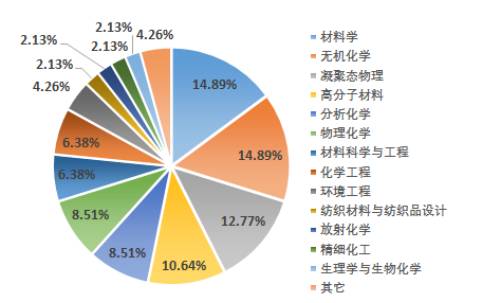 研究數(shù)據(jù)表明,近十年新增從事或涉及石墨烯研究的兩院院士主要集中在中國(guó)科學(xué)院化學(xué)部(42.55%)、中國(guó)工程院化工冶金與材料工程學(xué)部(14.89%)和中國(guó)科學(xué)院數(shù)學(xué)物理學(xué)部(10.64%),其中外籍院士占比為10.64%,引進(jìn)了多位石墨烯相關(guān)的國(guó)外人才。石墨烯相關(guān)研究的兩院院士由化學(xué)部、化工冶金與材料工程學(xué)部和數(shù)學(xué)物理學(xué)部逐步拓展到技術(shù)科學(xué)部、環(huán)境與輕紡工程學(xué)部、信息技術(shù)科學(xué)部、生命科學(xué)和醫(yī)學(xué)學(xué)部,表明石墨烯的應(yīng)用領(lǐng)域不斷拓寬,科學(xué)家的關(guān)注方向不斷變化。研究石墨烯的兩院院士專(zhuān)業(yè)主要分布在材料學(xué)、無(wú)機(jī)化學(xué)、凝聚態(tài)物理、高分子材料方向,在這四大傳統(tǒng)研究專(zhuān)業(yè)方向占據(jù)了總數(shù)的53.19%,表明我國(guó)在石墨烯材料基礎(chǔ)研究方面具有雄厚的科研實(shí)力。近年來(lái),石墨烯在環(huán)境、紡織和生物化學(xué)等領(lǐng)域的研究也變得活躍起來(lái),科學(xué)家對(duì)石墨烯的性質(zhì)和應(yīng)用研究方向逐步拓寬。