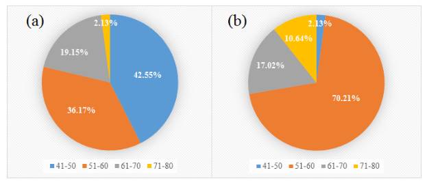 圖5 近十年新增石墨烯相關(guān)兩院院士年齡分布:(a)當(dāng)選年齡,(b)目前年齡