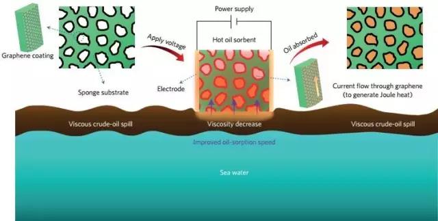 原油泄漏難處理主要是由于其高粘度的特性,為了可以原位的降低原油的黏度,課題組采用商業(yè)化的海綿運用石墨烯將其功能化,石墨烯具有高導(dǎo)電導(dǎo)熱性以及很高的機械強度和耐化學(xué)腐蝕性,是目前很熱的研究重點。另外,課題組將焦耳熱(即電流通過導(dǎo)體產(chǎn)生的熱量)引入到體系里來,以此來實現(xiàn)對泄露在水面的原油進行連續(xù)的回收。