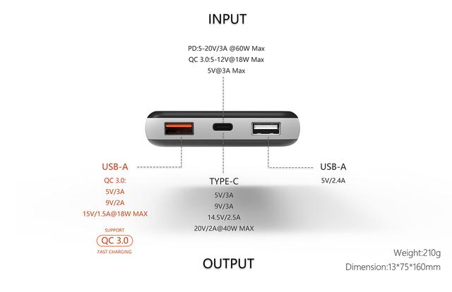 產(chǎn)品容量6000mAh,支持USB PD以及QC3.0雙向快充,帶有一個Type-C接口及兩個USB接口。Type-C輸入支持5-20V/3A(USB PD)、5-12V最大18W(QC3.0)、5V3A,在60W輸入的情況下20分鐘左右即可充滿電。Type-C輸出支持5V3A、9V3A、14.5V2.5A、20V2A,其中一個USB輸出接口支持QC3.0快充,規(guī)格為5V3A、9V2A、15V1.5A,另一個普通USB輸出接口則支持5V2.4A。