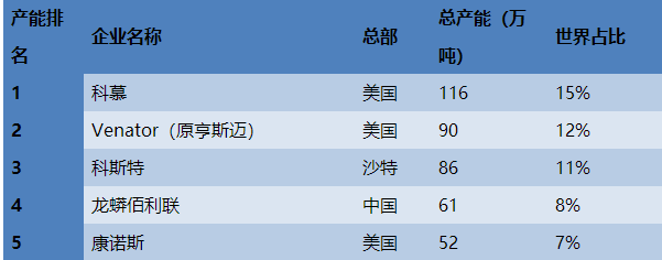 中國粉體網(wǎng)訊 2017年世界鈦白粉總產(chǎn)能約為750萬噸。從杜邦拆分出來的科慕依舊是行業(yè)老大,總產(chǎn)能116萬噸/年,約占世界產(chǎn)能的15%。Venator(原亨斯邁)占比12%;沙特阿拉伯的科斯特占比11%。中國的龍蟒佰利聯(lián)(002601,股吧)排名第四,約占世界產(chǎn)能的8%。加上康諾斯,前五名鈦白粉總產(chǎn)能占到世界產(chǎn)能的60%左右。