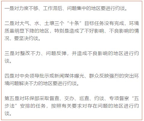 據(jù)悉,在環(huán)保督察過程中,環(huán)保約談是環(huán)保部很重要的督政手段,發(fā)揮著重要的震懾、警醒作用。它與函告、通報和移交問責(zé)等措施統(tǒng)稱為一套處罰機(jī)制。