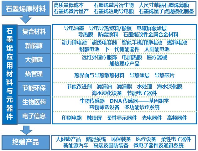 其中,2015年-2017年,產業(yè)化發(fā)展重點集中于石墨烯原材料的可控制制備、石墨烯在能源、復合材料、熱管理、節(jié)能環(huán)保等領域產業(yè)化延伸,逐步形成系列的產業(yè)集群。同時,在基礎材料,石墨烯膜材料領域將取得較大進展。