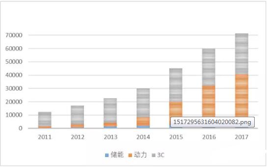 中國(guó)鋰電池三大終端電芯年產(chǎn)量(百萬Wh/年)