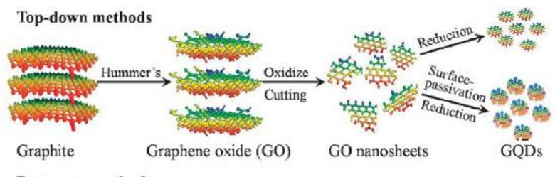 自上而下的方法是指通過物理或化學(xué)方法將大尺寸的石墨烯薄片切割成小尺寸的GQDs,包括水熱法、電化學(xué)法和化學(xué)剝離碳纖維法等等。