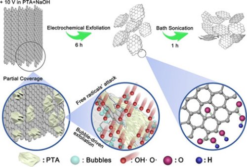 近日,中國科學(xué)院上海微系統(tǒng)與信息技術(shù)研究所石墨烯粉體材料研究團(tuán)隊(duì)丁古巧、何朋等科研人員,在水溶性石墨烯材料制備方面取得進(jìn)展:基于創(chuàng)新的電化學(xué)技術(shù)和超聲輔助分散機(jī)制,在NaOH與PTA混合電解液體系中實(shí)現(xiàn)了少層高濃度水溶性石墨烯的制備,相關(guān)研究成果在線發(fā)表在Green Chemistry上。在這一體系中,研究人員通過控制電化學(xué)過程,使PTA析出并吸附于石墨電極,促進(jìn)石墨充分氧化和逐層剝離,隨后輔以超聲處理進(jìn)一步提高產(chǎn)率,實(shí)現(xiàn)了高產(chǎn)率(87.3%)、高固含量(8.2 g/L)以及高穩(wěn)定性(8個(gè)月以上)的少層微米尺寸水溶性石墨烯的制備,相對(duì)于已有研究報(bào)道具有明顯優(yōu)勢(shì)。同時(shí),由于電化學(xué)陽極分子吸附保護(hù)機(jī)制,實(shí)現(xiàn)了產(chǎn)物片層sp2結(jié)構(gòu)的保留,制備成膜后,經(jīng)較低溫度熱還原便可獲得較高的電導(dǎo)率(9517 S/m),應(yīng)用潛力巨大。進(jìn)一步的機(jī)理研究明確了不同于以往插層、氧化、膨脹、剝離的電化學(xué)機(jī)制,逐層剝離和深入氧化的電化學(xué)新機(jī)制克服了傳統(tǒng)電化學(xué)方法剝離不完全導(dǎo)致的產(chǎn)物層數(shù)多、質(zhì)量低、分散性差等問題。同時(shí),進(jìn)一步的研究確定了超聲在不同環(huán)境、不同處理時(shí)間及不同前驅(qū)體條件下的效果,對(duì)后續(xù)研究中的工藝改進(jìn)具有重要指導(dǎo)意義。所制得的水溶性石墨烯極易成膜,在電熱方面表現(xiàn)出低電壓、高速升溫和溫度一致性好等優(yōu)點(diǎn),有望作為新型電熱材料推廣應(yīng)用。
