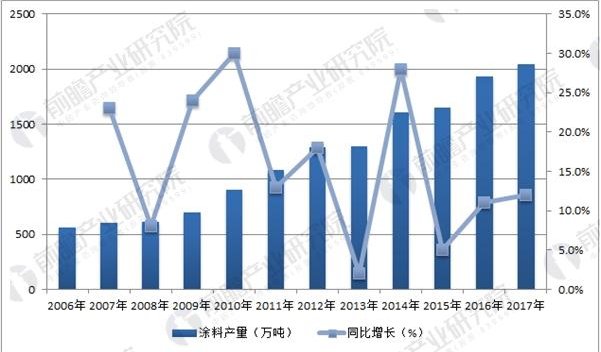 據(jù)前瞻產(chǎn)業(yè)研究院發(fā)布的《涂料行業(yè)市場需求預(yù)測與投資戰(zhàn)略規(guī)劃分析報告》數(shù)據(jù)顯示,2017年中國涂料產(chǎn)量達到2041萬噸,首次突破2000萬噸大關(guān)。同期,中國涂料產(chǎn)品出口總量為20.1萬噸,同比增長12.9%;進口總量為18.7萬噸,同比增長7.6%;表觀消費量為2039.6萬噸,調(diào)整后同比增長12.3%。