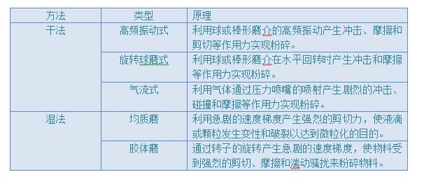 物理法主要是利用機械力的粉碎法,據(jù)粉碎力原理的不同,包括干法粉碎和濕法粉碎。干法有旋轉(zhuǎn)球 (棒) 磨式、振動磨式、氣流式等幾種形式。濕法粉碎主要是利用膠體磨和均質(zhì)機。