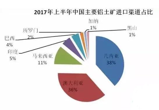 2017年上半年,幾內(nèi)亞共計(jì)向中國(guó)出口鋁土礦約1218萬(wàn)噸,占中國(guó)進(jìn)口總量的38.1%,其次是澳大利亞,約1164萬(wàn)噸,占比36.4%。