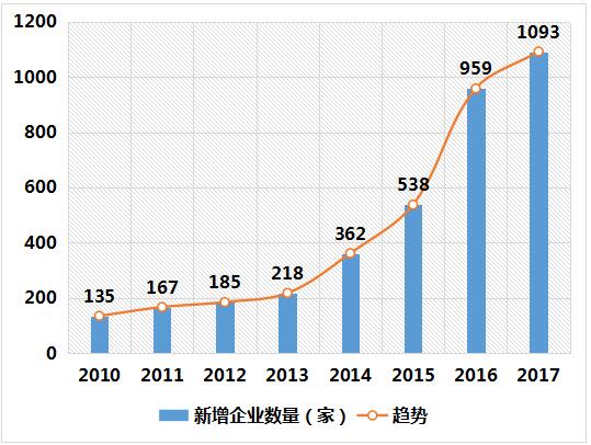 中國石墨烯企業(yè)數(shù)量增長趨勢圖(數(shù)據(jù)來源:啟信寶、CGIA Research整理)