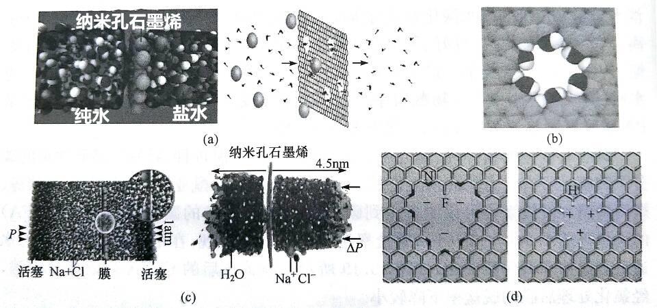 (a)納米孔石墨烯海水淡化;(b)帶有親水鍵的納米孔;(c)計(jì)算機(jī)模擬石墨烯過濾;(d)帶有親水鍵納米孔(左)和官能化的納米孔(右)