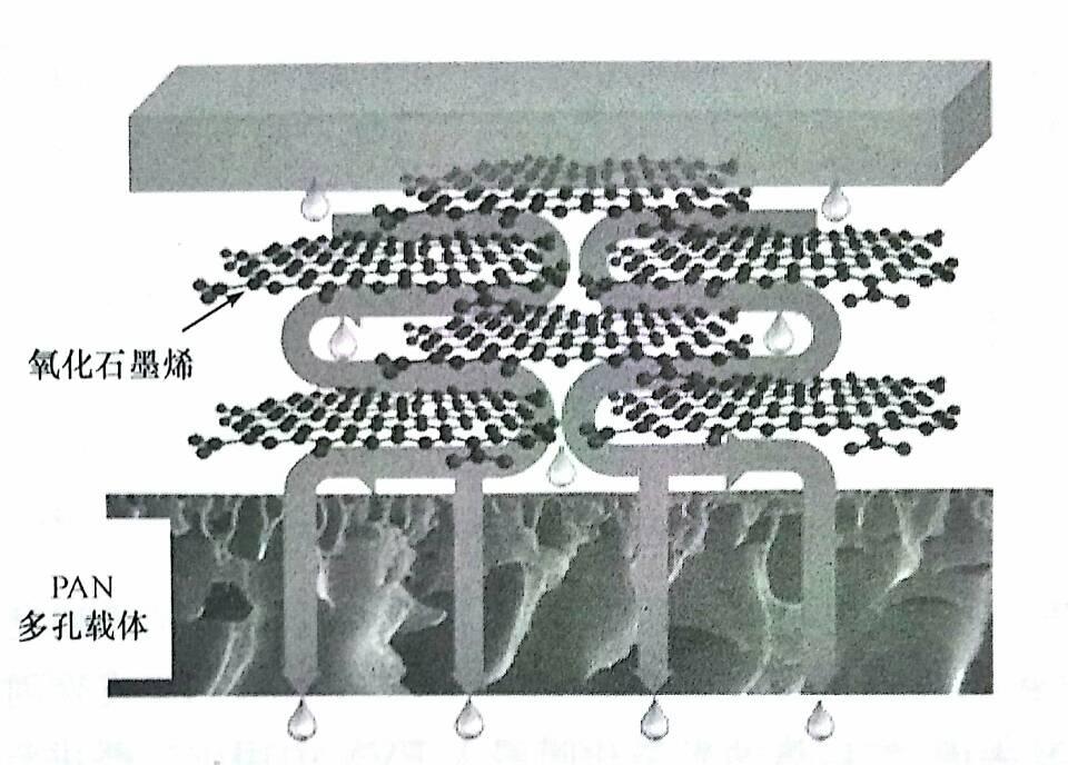氧化石墨烯膜是近年來才研制出的一種新型可以用于海水淡化的膜,其具有制備簡單,機(jī)械強(qiáng)度高,可工業(yè)化生產(chǎn)。氧化石墨烯(GO)片層可以堆疊成單層膜,膜上有數(shù)百萬納米毛細(xì)管。小的離子可以快速穿過GO膜,吸收的離子對(duì)膜的滲透性能沒有影響,主要影響膜滲透速率的是水合半徑。