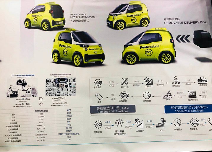 關于XEV,母公司在香港,未來將作為上市主體,意大利有限公司負責總技術研發(fā),在倫敦做3D 打印研發(fā),目前正在尋找在國內建廠的地址和A輪融資。這家公司將在2019年交付第一批 XEV 低速電動量產車,而后他們還將有3D打印高速乘用車的量產計劃。