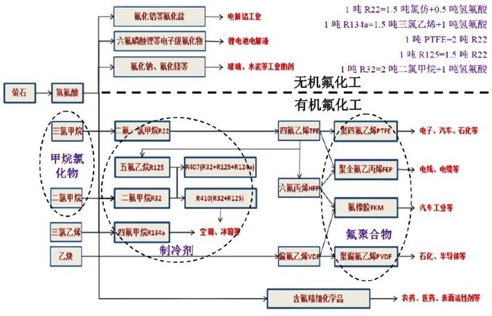 新能源工業(yè)中,含氟材料發(fā)揮著不可或缺的作用,主要產(chǎn)品包括鋰電池材料六氟磷酸鋰、鍍鋁硼氫氟酸電解液、各項(xiàng)性能優(yōu)良的含氟太陽(yáng)能電池背膜、太陽(yáng)能面板清洗及玻璃雕刻用高純氫氟酸等。