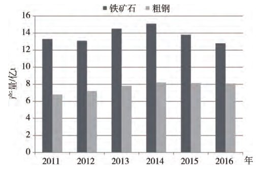 2011~2016年中國(guó)鐵礦石、粗鋼產(chǎn)量變化