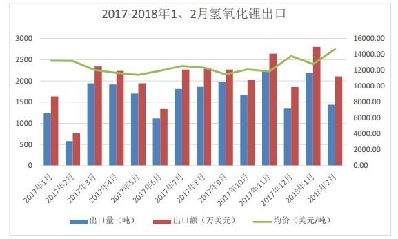 2018年2月中國氫氧化鋰出口量為1439.215噸,同比增加147.38%,環(huán)比減少34.33%,離岸均價14624.98美元/噸,同比上升11.14%,環(huán)比上升14.5%。1-2月份氫氧化鋰出口合計3630.79噸,同比大幅增長99.26%。1月份出口量的環(huán)比大幅回升,主要是由日韓地區(qū)出口量恢復(fù)帶動。2月份有所下降主要由于春節(jié)停產(chǎn)導(dǎo)致。