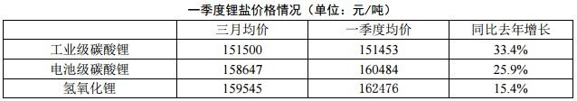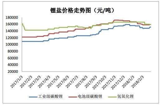 2018年一季度電池級碳酸鋰均價160484同比去年增長25.9%