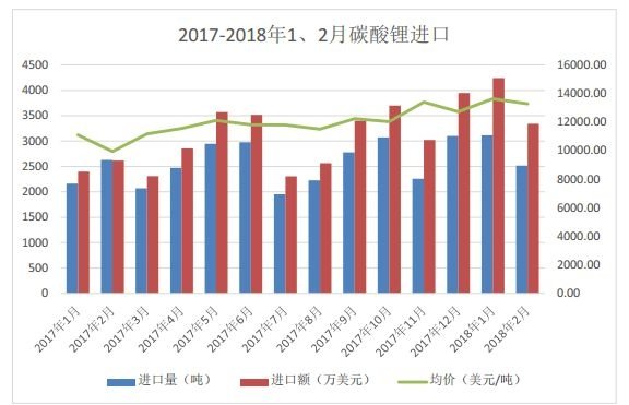 2018年2月中國碳酸鋰進口2517.09噸,同比減少4.36%,環(huán)比減少19.16%,離岸進口均價13283.27美元/噸,環(huán)比下降3%,同比上升34%。2月傳統(tǒng)春節(jié),部分下游廠商停止采購,導(dǎo)致碳酸鋰進口有所下降。