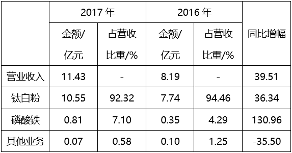 公司主要從事鈦白粉產(chǎn)品的生產(chǎn)和銷售,主要產(chǎn)品為鈦白粉系列產(chǎn)品。公司控股子公司銅陵納源從事磷酸鐵產(chǎn)品的生產(chǎn)和銷售,主要產(chǎn)品為磷酸鐵系列產(chǎn)品。